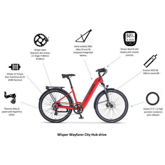 WISPER Wayfarer H7 Step-Through Electric Bike - Top Speed 15.5mph | 60-90mil Range | Hi Torque Hub-Drive | 250W Power - Red